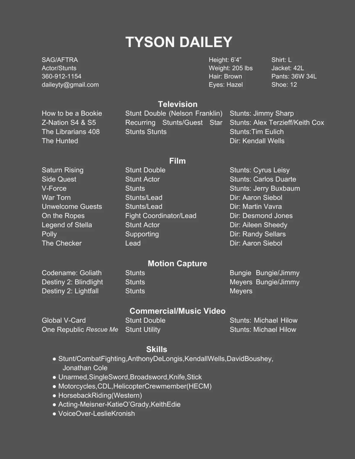 I’m Tyson Dailey, an actor, model, and stunt performer based in the Pacific Northwest. Standing at 6’4”, I bring a commanding on-camera presence shaped by years of experience in film, television, and motion capture. My work has ranged from lead roles in independent films to stunt performance and coordination on major productions like Z-Nation, The Librarians, and Destiny 2.